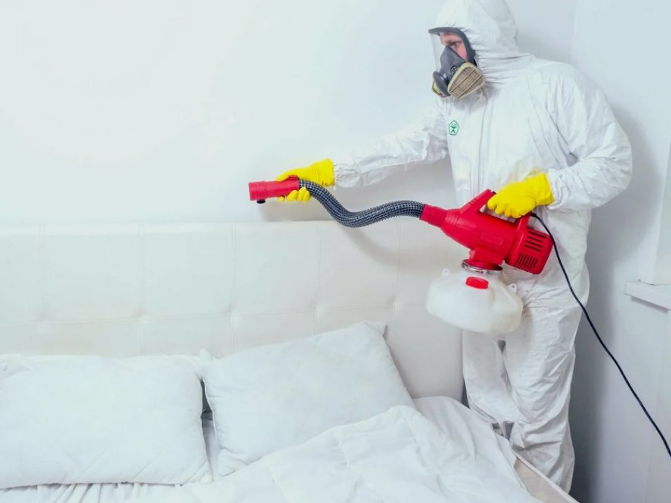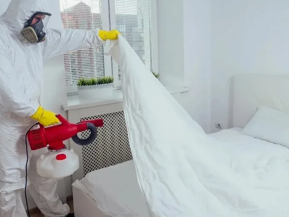 Специалист использует специальный генератор, который распыляет инсектицид в виде мельчайших частиц. Это облако оседает на разных поверхностях, включая мебель, ковры и текстиль.