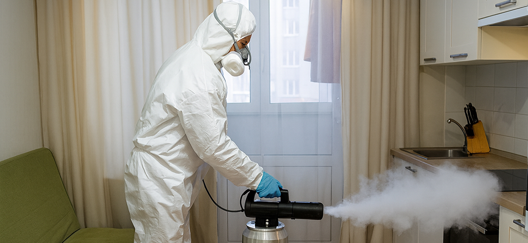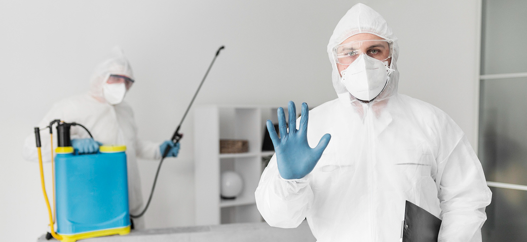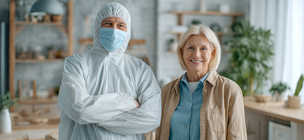 Специалист в комбинезоне и маске и клиент стоят на фоне чистой (обработанной) квартиры